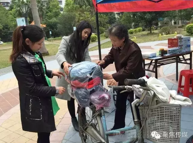 一位骑着自行车拉衣服来的阿姨,车前车后装满着。一边交衣服一边和工作人员说道:“我已经退休了,现在闲没事做了,你们下乡去转赠衣物的时候记得通知我哦”,接着工作人员将她的联系方式记录了下来。
