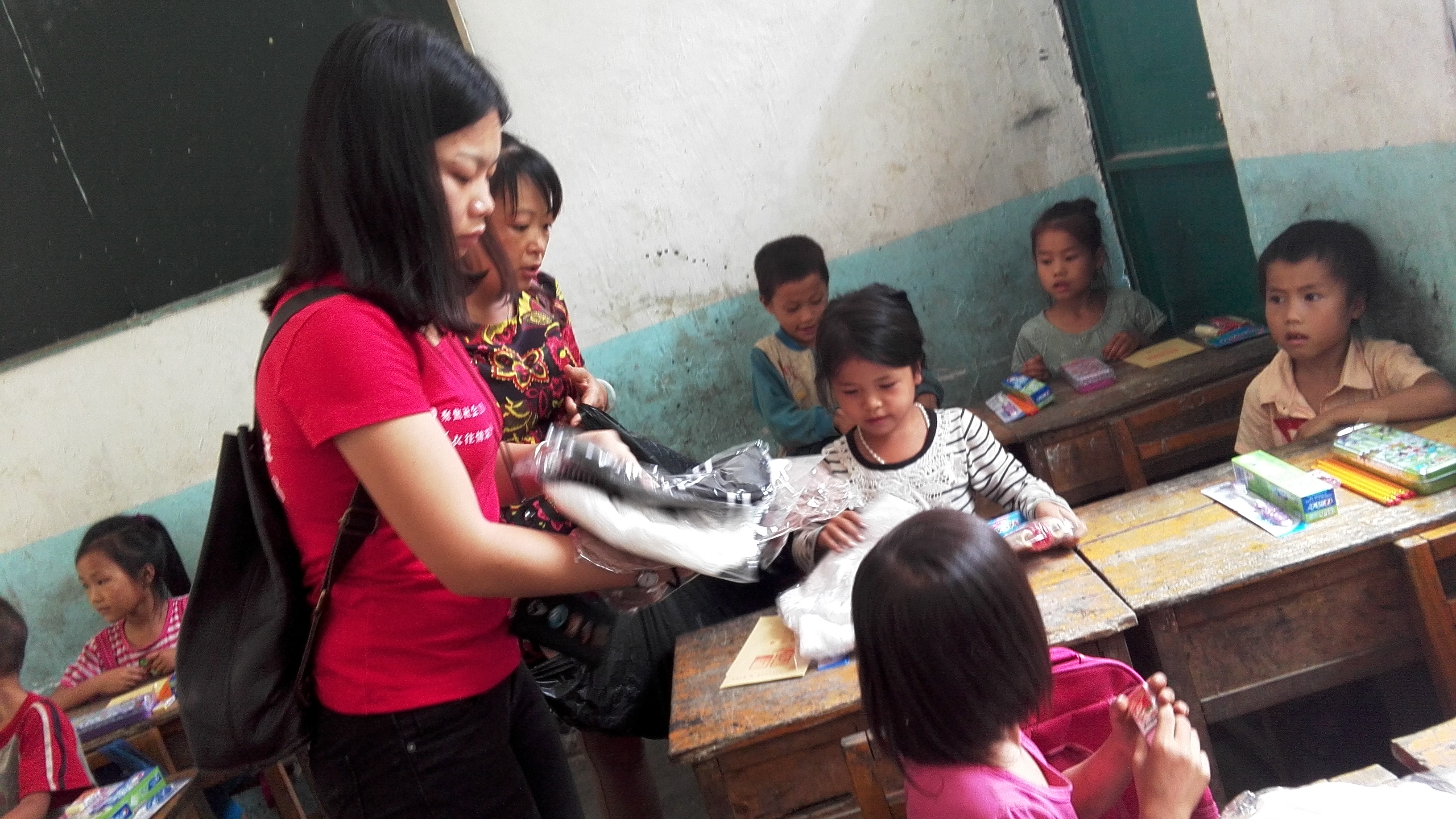 图2、3 :爱心人士正在把爱心衣物、文具、生活用品等物资总给孩子们