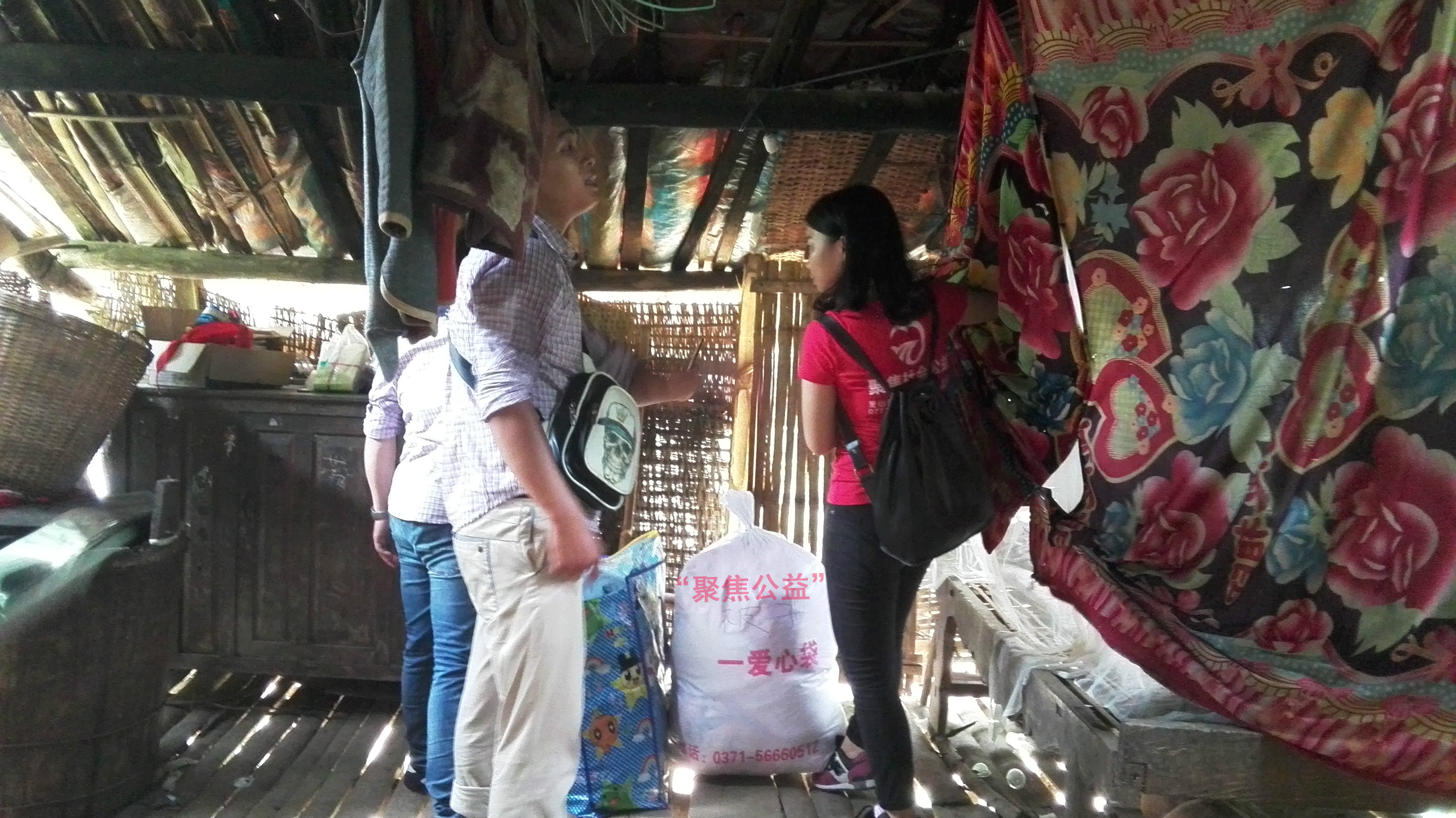 当看到三个孩子的家时,所有在场的爱心人士热泪盈眶、心酸不已。简单的木板、塑料布拼成的两层小木楼就是这三个小朋友的家,家里没有任何值钱的家具,只有一张床,不通电不通水。小木楼上层住着三兄妹,下层养着一只羊,中间的隔层是由薄薄的木板隔开,踩上去发出“咯吱咯吱”的响声,感觉随时都有断裂的可能。爱心人士把衣物、棉被、生活用品等爱心物资放在三兄妹的家里,狼竹公益组织的一位工作人员看着这令人心酸的环境,没有一丝犹豫的把包里随身携带食物全都拿出来放到三兄妹的床上,并用棉被盖起来,希望孩子们回到家里可以有一点小惊喜。