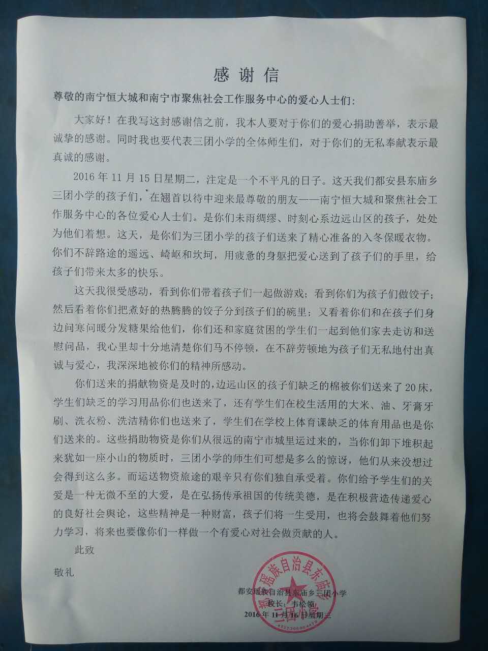 让爱心人士们感到更暖心和意外的是,三团小学的校长在转赠结束之后,特意写了一封谢意满满的信给所有的爱心人士~