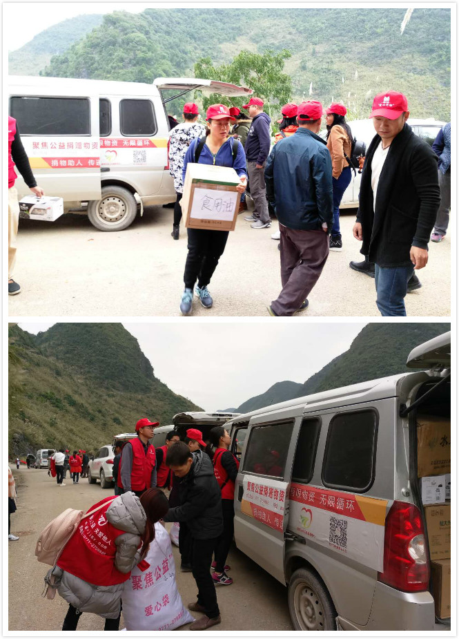 通往教学点的很多路段一边是悬崖、一边是峭壁,让初次来到这里的爱心人士们搬运物资时都不敢往下望。得知需要搬运物资,屯里的老人、孩子们也纷纷加入爱心搬运的队伍中。由于山路大部分都崎岖、陡峭,很多爱心人士搬运物资走到一半的路程时已经累得气喘吁吁。