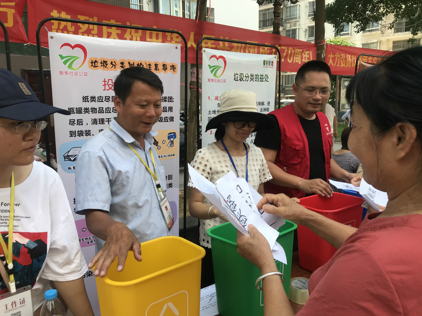 游园现场共有5个活动项目:垃圾分类有奖问答、知识问答(内容包括建国70周年、创文明城、扫黑除恶等方面的问题)、掌上明珠、趣味保龄球、限时夹球。