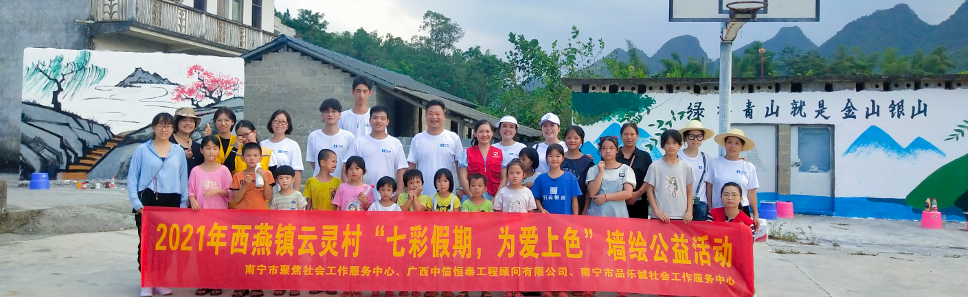 为进一步加强农村留守儿童关爱保护工作,丰富农村留守儿童假期生活,助力乡村振兴工作。8月25日,南宁市聚焦社会工作服务中心党支部携手广西中信恒泰工程顾问有限公司、南宁市品乐诚社会工作服务中心以及上林县西燕镇云灵村民委员会共同举办2021年西燕镇云灵村“七彩假期,为爱上色”墙绘公益活动。