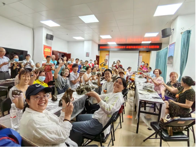 端午节包粽子、品香粽是必不可少的环节。居民们围在一起用糯米包粽子,捋粽叶、做漏斗状、填糯米、压紧实、封口、扎捆,不一会儿功夫,一个个肉粽、凉粽瞬间成型。在包粽子过程中,大家互相交流,互相学习。一片片清香的粽叶、一粒粒晶莹的糯米,在一双双巧手下,瞬间变成了漂亮诱人的粽子,整个活动现场其乐融融。